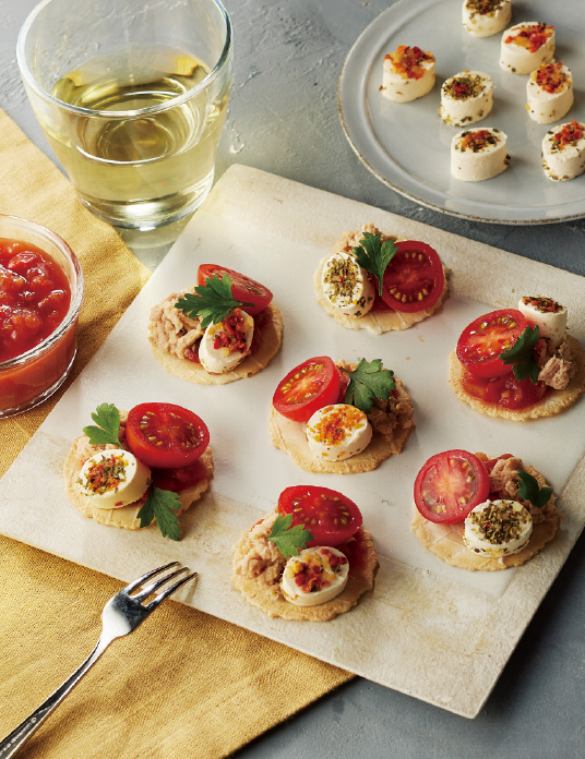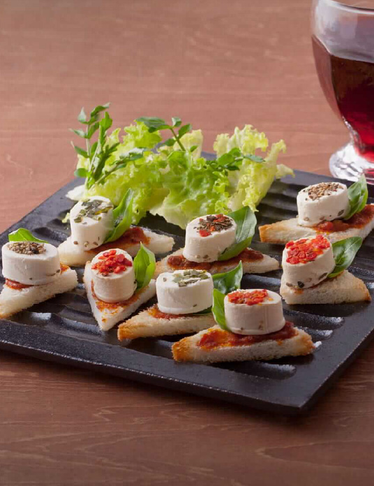 口どけ爽やかな一口サイズのクリームチーズに、 プロヴァンス風は、赤ピーマン・バジル・タイム・アサツキなどを。コート・ダジュール風は、トマト・オレガノ・バジル・ニンニクなどをトッピング1プレートでそれぞれに沿った彩りと4種の味わいが楽しめます。